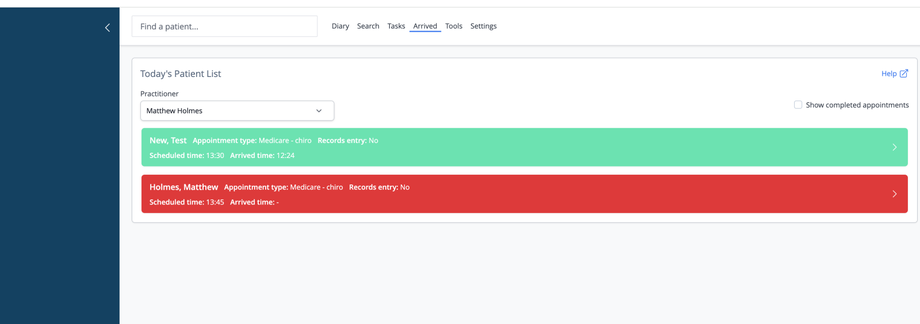 On page load it will scroll to the most appointments that have been marked as arrived, or if none are marked arrived, the next appointment. Appointments that have had a clinical entry entered against them will be changed to grey and will be hidden by default. You can still see these appointment by clicking "Show completed appointments".