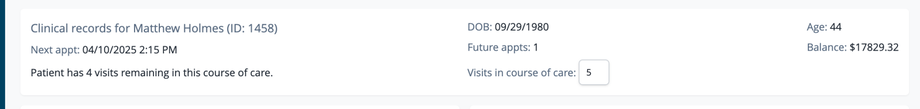 The clinical records screen is the center of your clinical record keeping for the patient. The screen is composed of several sections. The top section contains basic details about the patient, their account and visit schedule.
