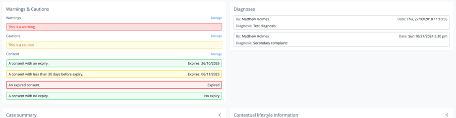 The next section contains information about any Warnings, Cautions, Consents and Diagnoses current for the patient.