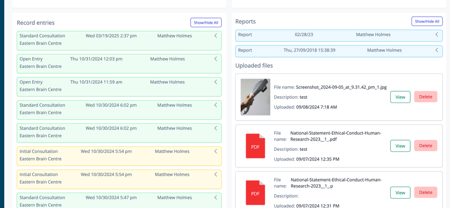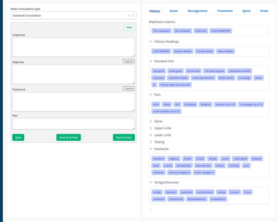 The next section is where clinical records are created. It contains the various templates for clinical notes, as well as the means for entering Warnings, Cautions, Consents, Diagnoses, and Reports. To the side or below (desktop or mobile view respectively) is the Macros section, the buttons of which allow you to enter text into the clinical record templates.