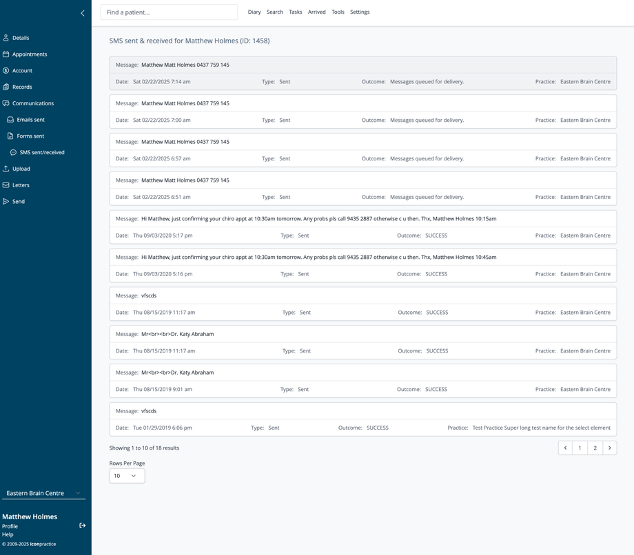 The SMS Sent & Received screen provides a comprehensive history of all text message communications with a specific patient. This interface allows practitioners and administrative staff to track SMS history, monitor delivery status, and review the content of previous messages.