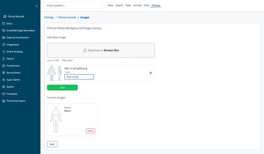 The images stored in this library will be available as background templates when creating clinical notes, allowing practitioners to mark and annotate directly on anatomical diagrams during creation of patient records.