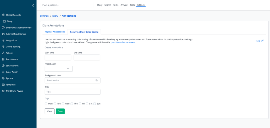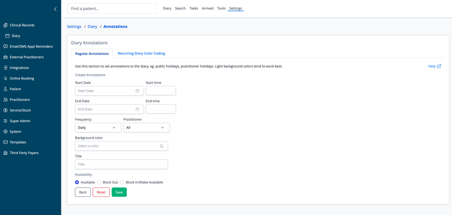 The Diary Annotations feature allows you to mark special periods or recurring time slots in your appointment calendar. These visual indicators help organize your schedule, identify special events, and manage practitioner availability.