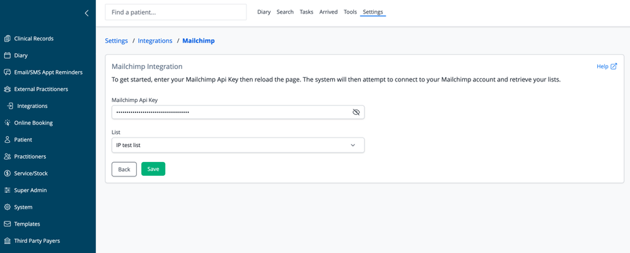 - Enter the Mailchimp API key into iconpractice on the Mailchimp Integrations page.