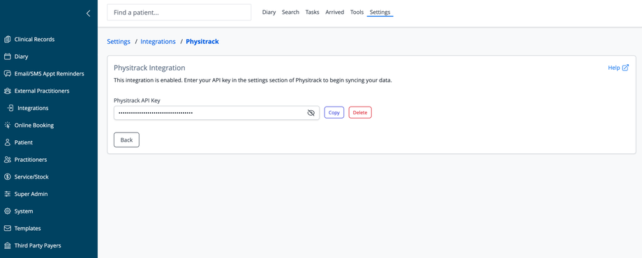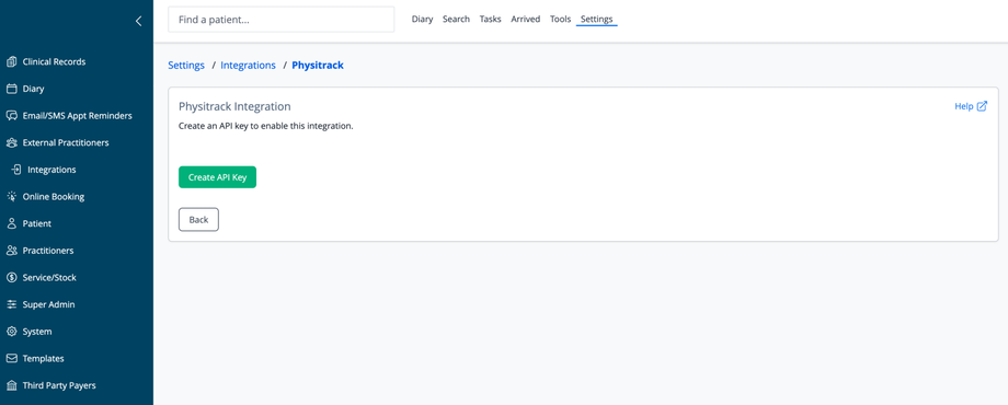Then head to the Settings section within your Physitrack account. Under Integrations select iconpractice from the list of software options and paste your Key into the API Key field. Click Save Changes.