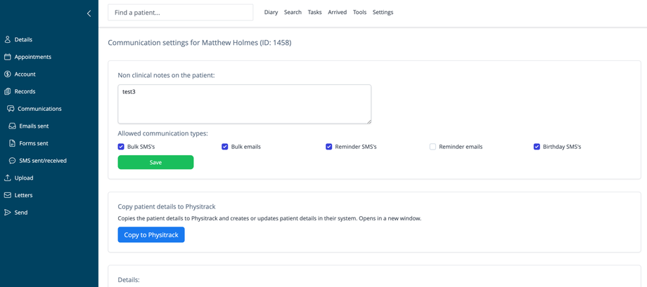 Note: every time you click the "Copy to Physitrack" the current details will be sent across. If the patient's name or contact details have been updated in iconpractice, the new details will pass to Physitrack.