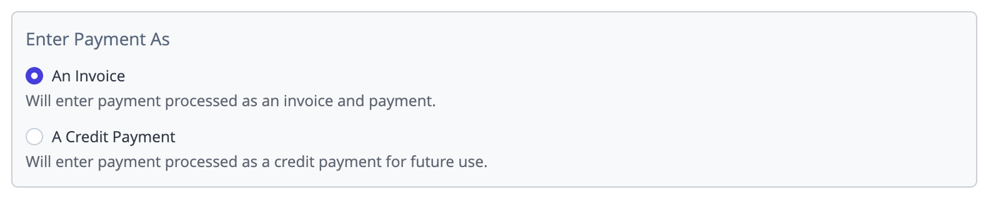 You may choose to have the system process the payment as an invoice with an accompanying payment, or as a credit payment which can be applied to an invoice later.