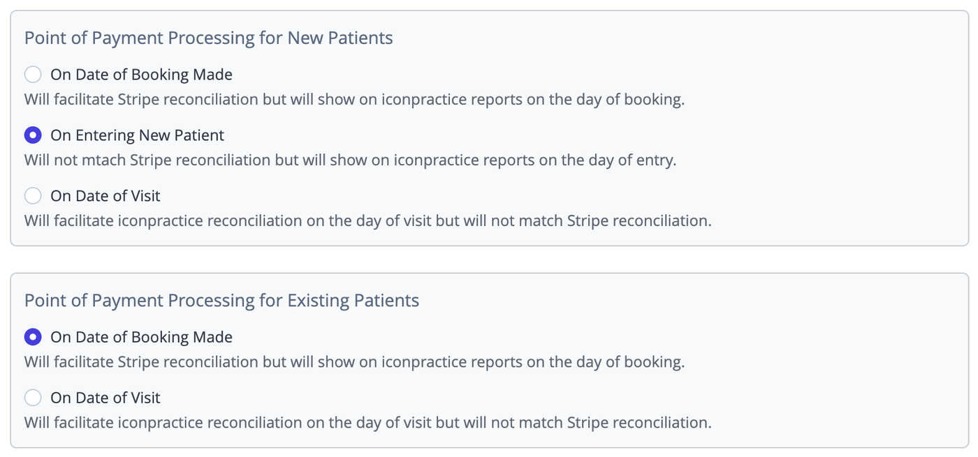 For existing patient bookings that can be successfully linked to an existing patient at the time of booking, the payment will be processed onto their account immediately and will be visible on the Daily Invoices and Payments report for the processing date you have chosen. For example, if you have chosen on the date of the appointment visit, it will be visible on the report for that date. If is is the date of booking, it will be the date the patient made the appointment online. For existing patient appointments that need to be validated to link them to a patient, the pre-payment will be processed at that moment and entered with a date for the processing date you have chosen.