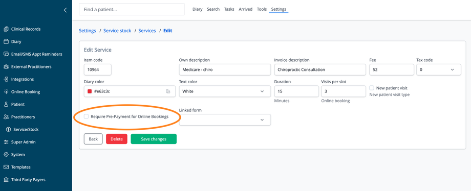 On the respective page for the service item, tick the "Require Pre-Payment for Online Bookings", then “Save changes”. The service or group appointment will now require pre-payment.