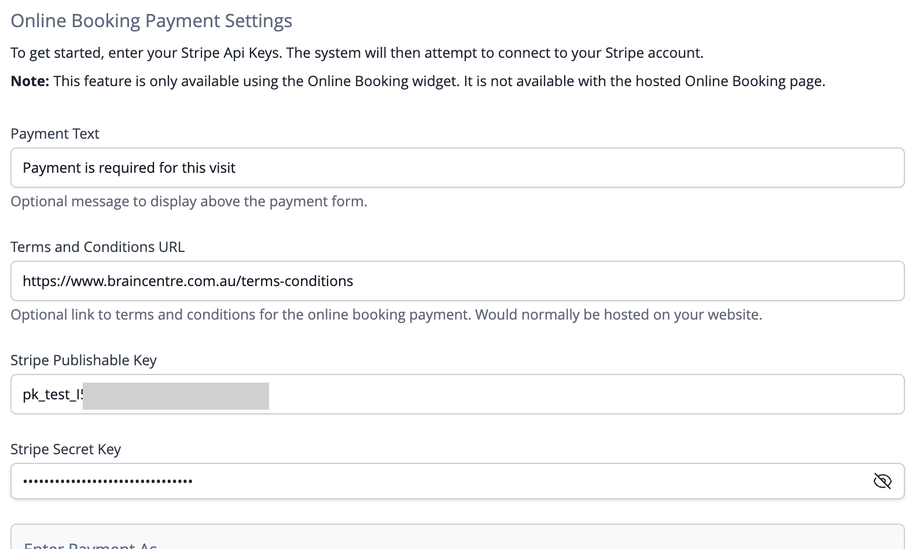 To link the online booking with your Stripe Account, head to Settings->Online Booking->Online Booking Payment Settings.