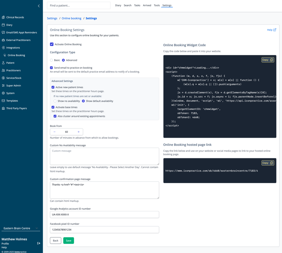 - Send email to practice on booking: When enabled, an email will be sent to the default practice email address to notify of a booking.