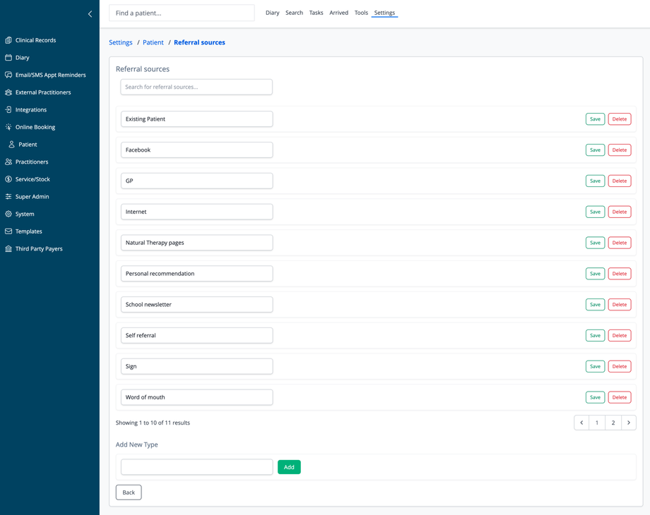The Referral Sources page allows you to manage the list of options that track how patients discover your practice. This feature helps you understand which marketing channels and referral pathways are most effective for attracting new patients.