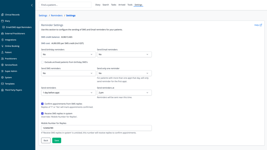 - When "Receive SMS replies in system" is unticked, the mobile number field is used to receive appointment confirmations