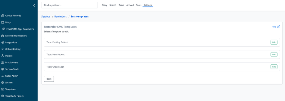 The SMS Reminder Templates section allows you to create and manage the text messages sent to patients about their upcoming appointments. These templates help maintain consistent communication while keeping messages concise and within SMS character limits.