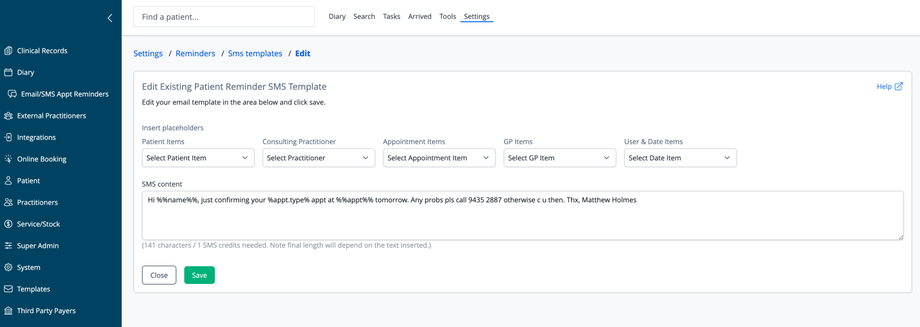 Note: in iconpractice 2.0 different placeholders are used in the SMS reminders. The previous placeholders will continue to work, however we recommend you replace them with the new placeholders.