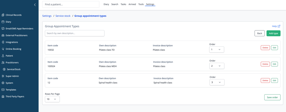 The Group Appointment Types section allows you to configure services that accommodate multiple patients in a single appointment slot. This feature is ideal for classes, workshops, and group therapy sessions.