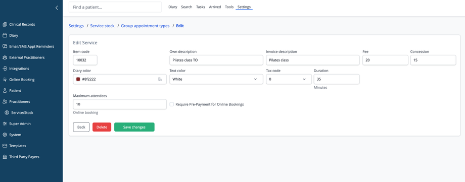 - Invoice description: How it appears on invoices and in online booking (e.g., "Pilates class")