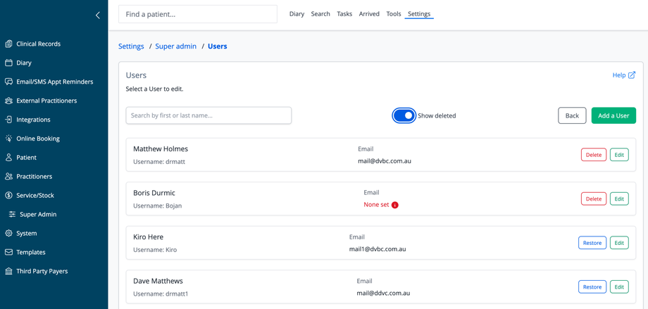 - Show deleted: Toggle to display previously deleted users