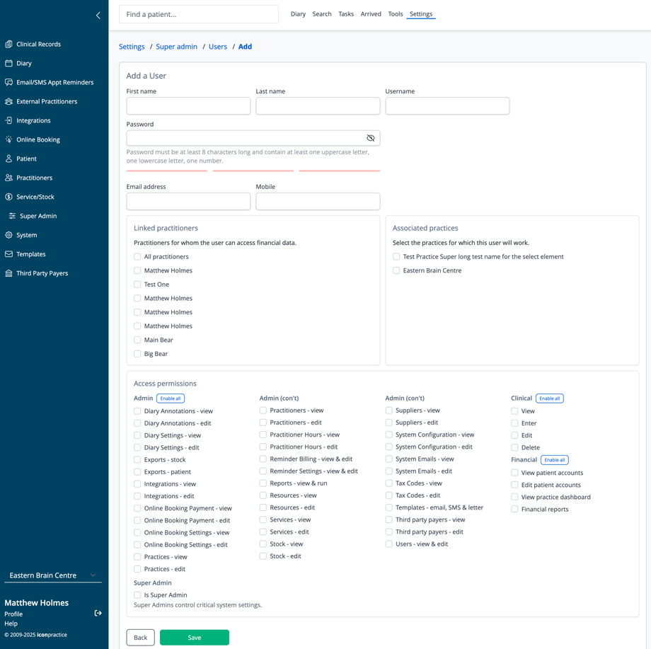 - Select the practices where this user will have access