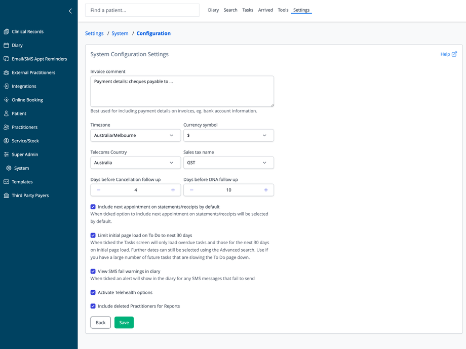 The System Configuration section allows administrators to customize global settings that affect how the entire practice management system operates. These settings control financial information, regional preferences, appointment follow-ups, and various system behaviors.