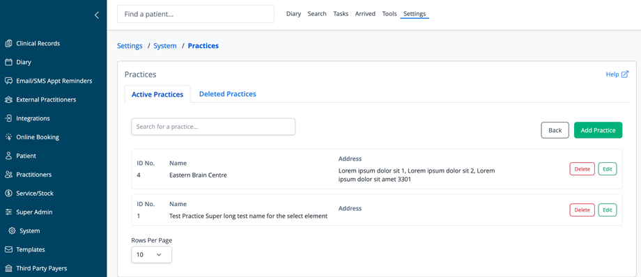 - Delete: Remove the practice (it will move to Deleted Practices)