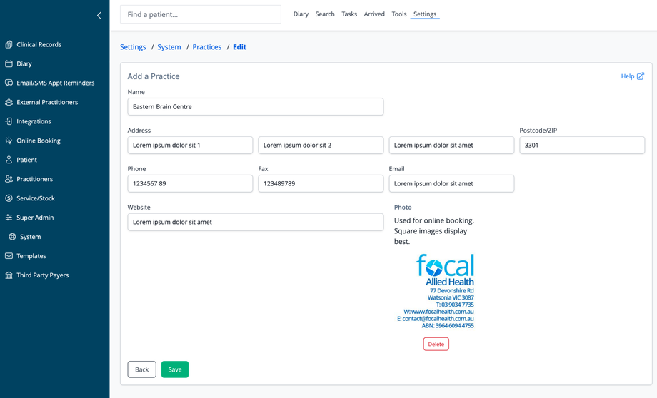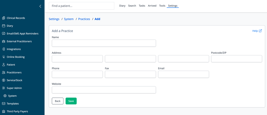 The Practices section allows administrators to manage multiple practice locations within the system. This feature helps organizations with multiple sites or branches maintain separate information while sharing the same system and patient database.