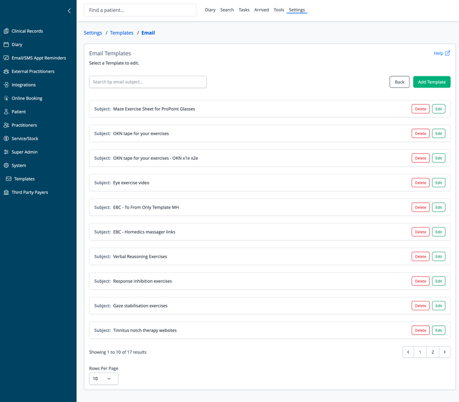 The Email Templates section allows practitioners to create, edit, and manage customized email templates for patient communications. These templates streamline communication for common scenarios like sending exercise instructions, therapy information, and clinical resources.