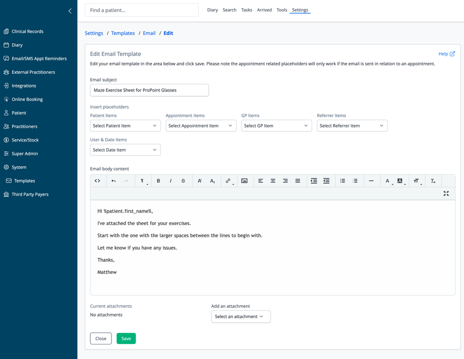 Note: If the preferred name placeholder is used in a template, and the patient does not have a preferred name saved, the system will automatically insert the first name instead.
