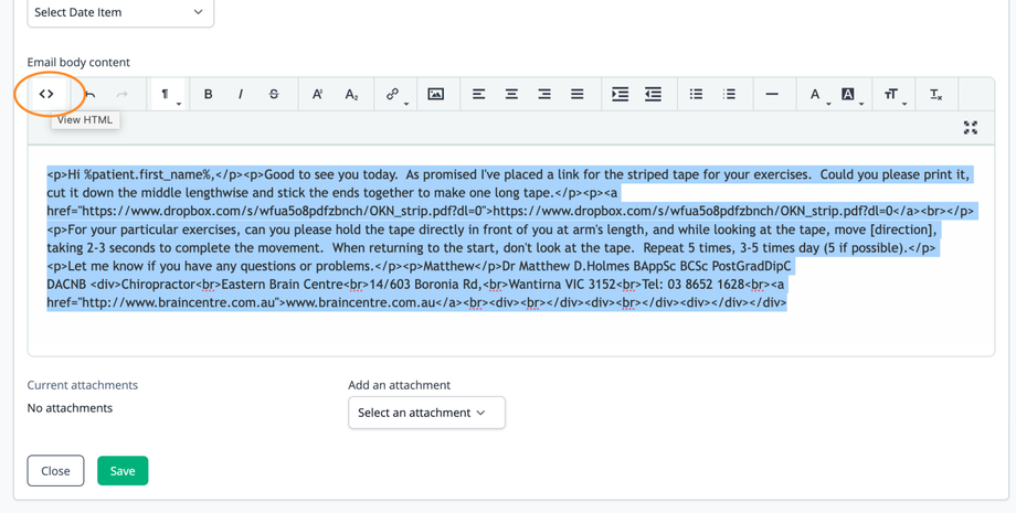 - Click the "View HTML" button again to return to the normal view. Your email should now display correctly as shown below. If so, you can now save the template.