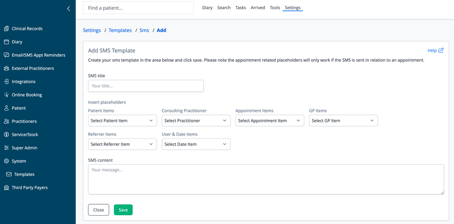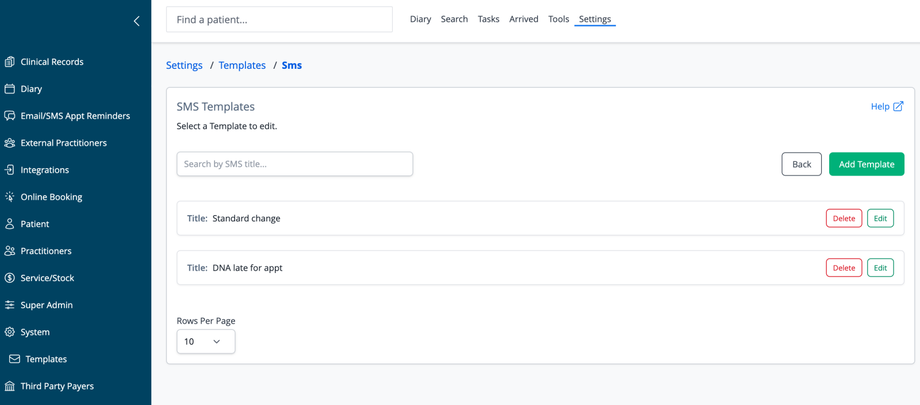 The SMS Templates section allows practitioners to create, edit, and manage customized text message templates for patient communications. These templates streamline follow-ups, bulk SMS's and other brief communications while maintaining consistency across the practice.