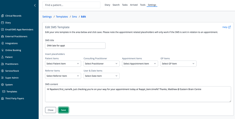 Important note: Appointment-related placeholders will only work if the SMS is sent in relation to an appointment