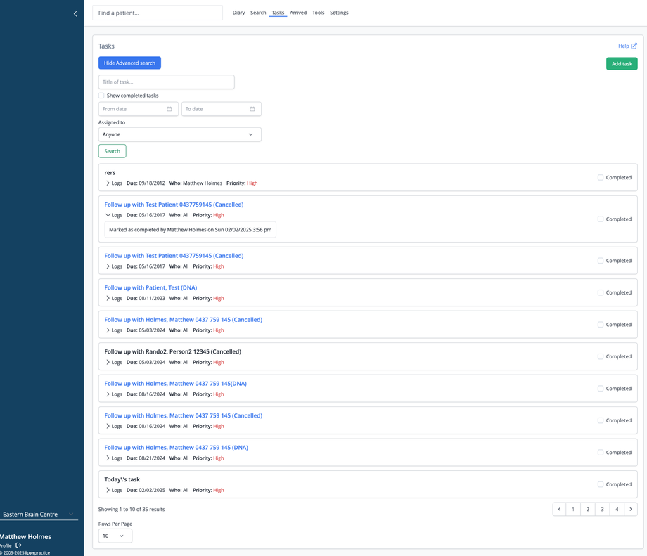 - Tasks can be automatically generated from patient actions (such as cancellations or DNAs)