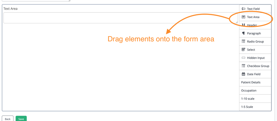 To create form elements, drag, and drop elements onto the form field, using the options on the right hand side. The "Patient Details" element on the right hand side, is designed for new patient forms, as it contains all the elements needed when inputting a new patient into the system.