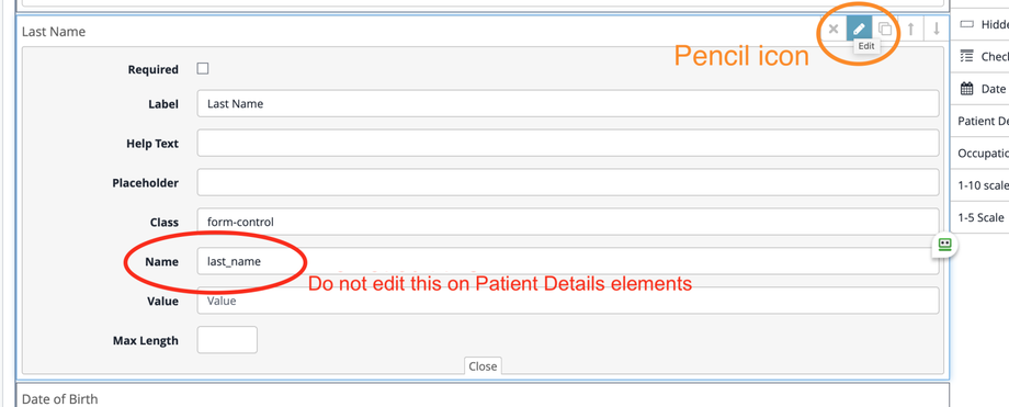You may edit the form elements by hovering over the form element, and clicking the pencil icon. If you are using the "Patient Details" element we recommend you do NOT edit the Name field on an element as it will break the ability of the system to integrate the fields with the inputting of new patients.