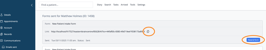 To view forms that have been sent for existing patients, go to the Communications -> Forms section of their details. On that page you can see a list of the forms that have been sent, the form links (available for copying) and a "Resend form" button.