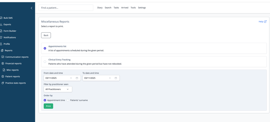- Filter by practitioner seen: Limit results to appointments with specific practitioners using the dropdown menu