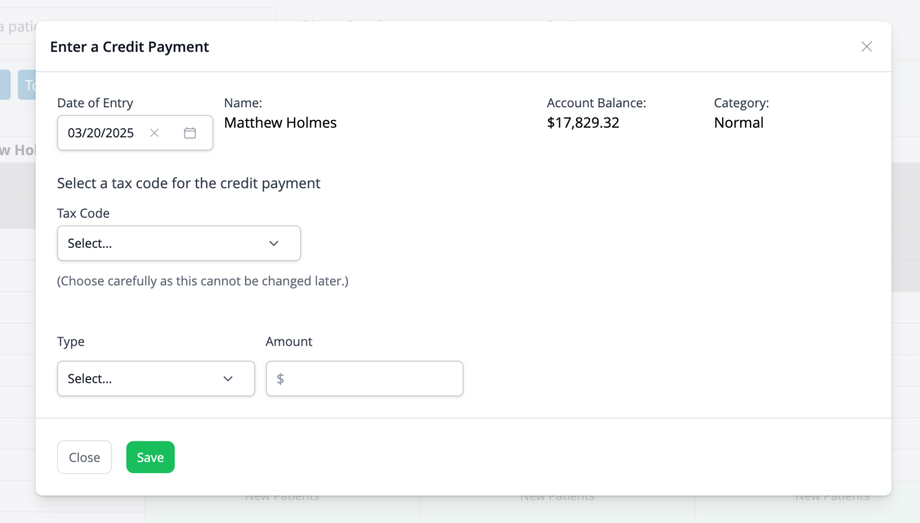 This credit will be available to apply to future transactions. If the patient is a "Master account", the credit will also be available for any linked secondary accounts.