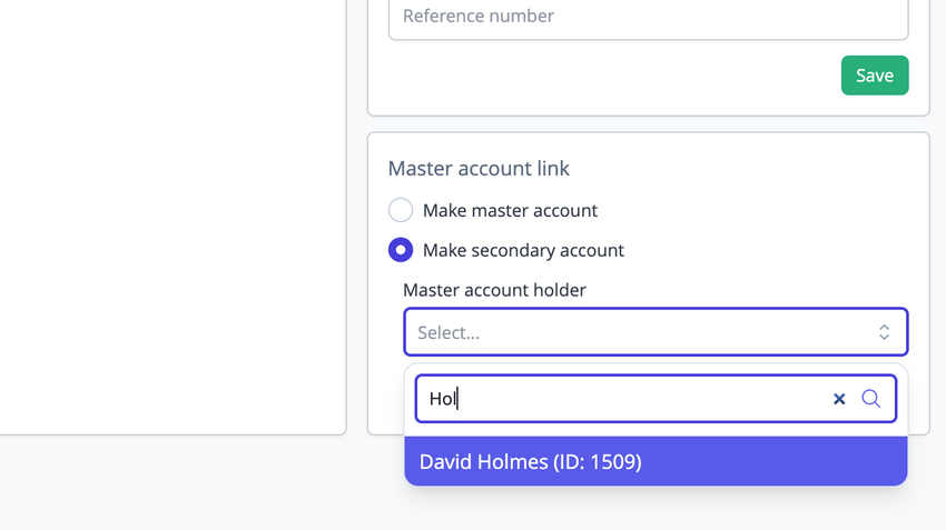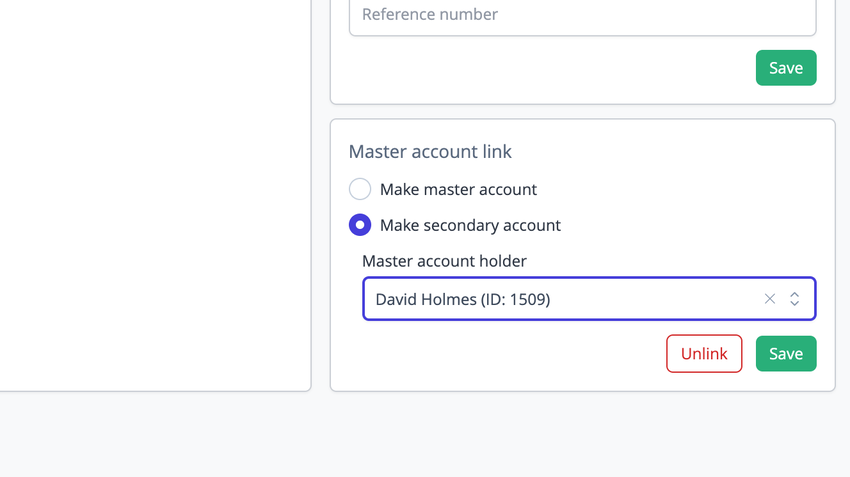 To link someone to a Master account, go to the "Master Account Link" section and select the "Make a Secondary Account" radio button, then in the "Search for Master Acc:" field that shows, search for the Master account to which you wish to link and select it from the results. Then click Save.